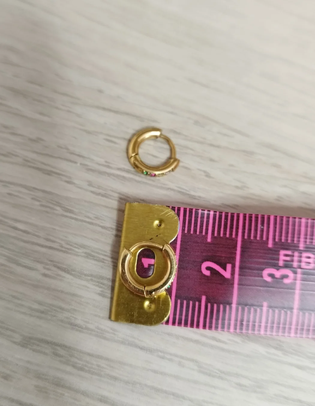 Aros color dorado con parte frontal de brillantitos. Miden 1cm de diámetro. En acero de alta calidad resistente al agua y antialérgico. Incluye el par.