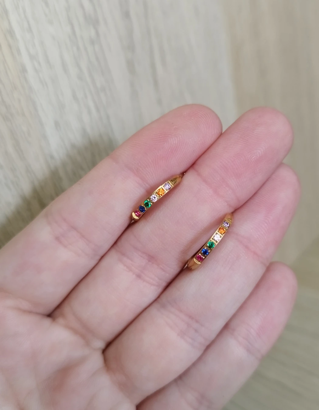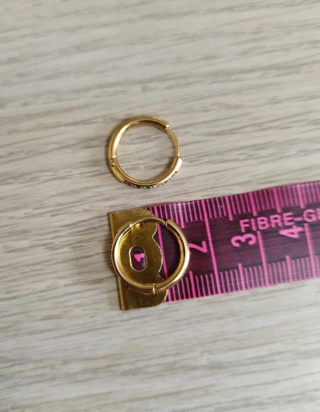 Aros color dorado con parte frontal de brillantitos de colores. Miden 1,5cm de diámetro. En acero de alta calidad resistente al agua y antialérgico. Incluye el par.