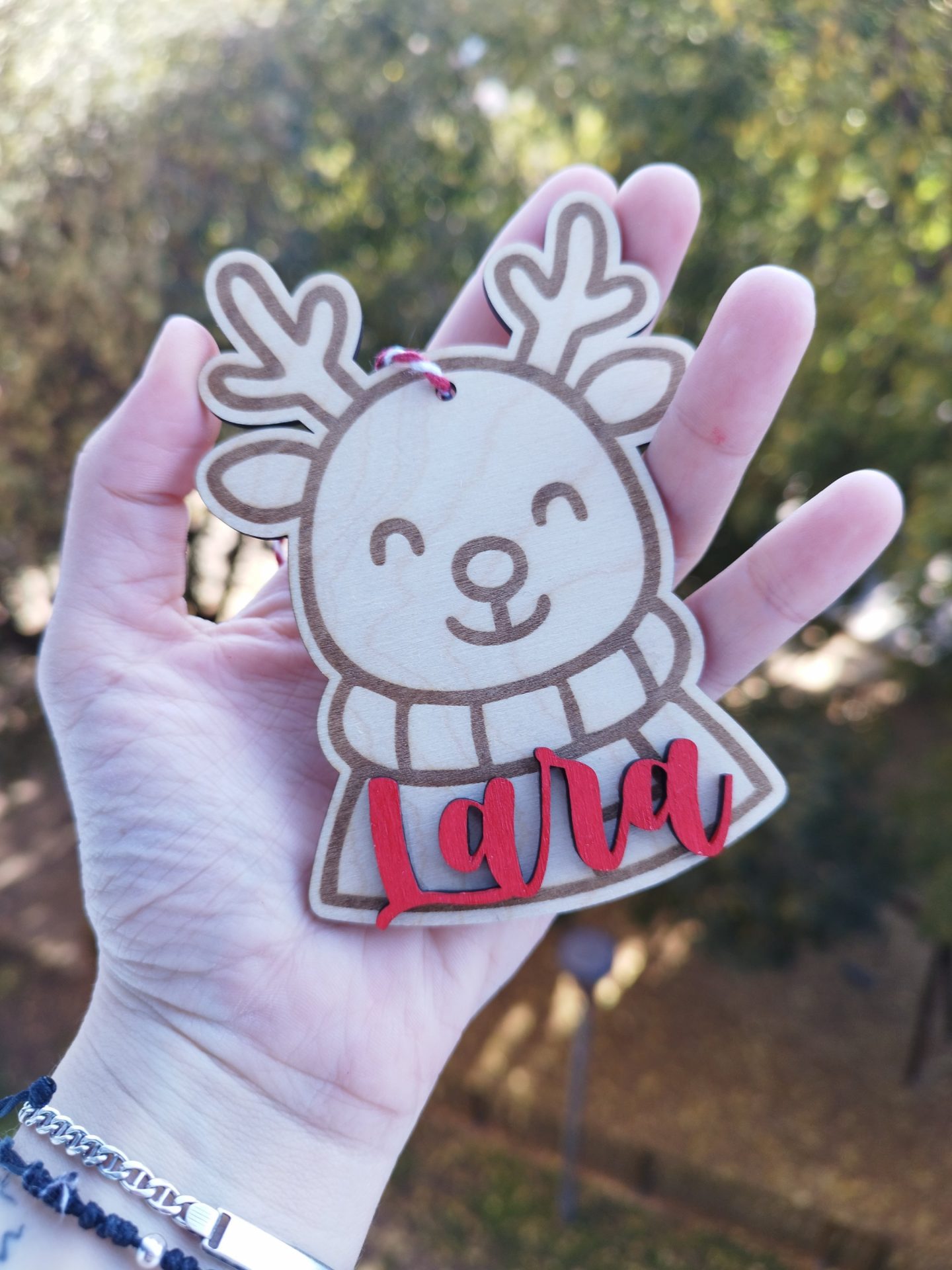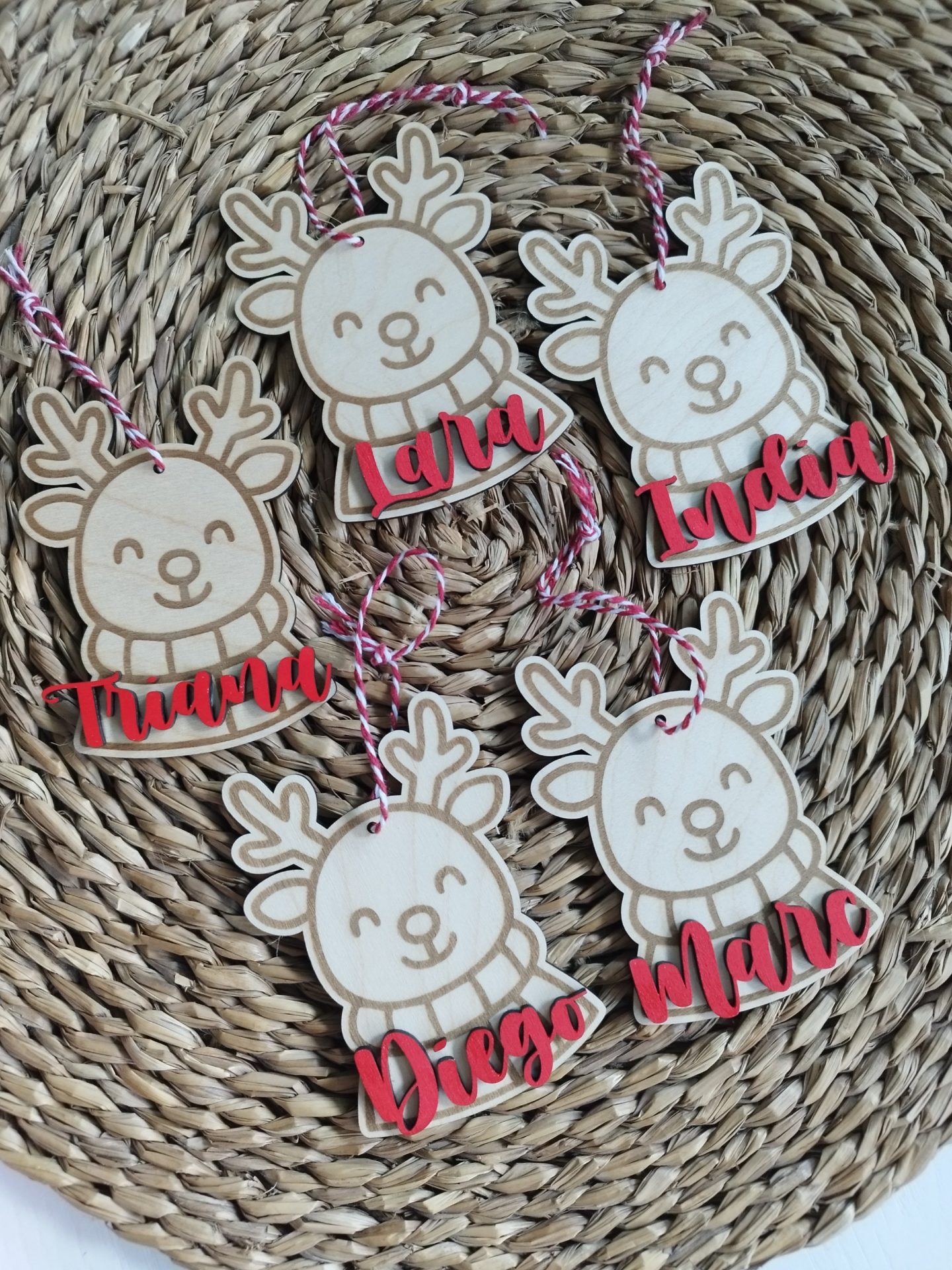 Adorno personalizado para el árbol o ideal como marcasitio navideño. Hecho en madera de pino, con el nombre pintado a mano. Da un toque especial a estas navidades con esta decoración navideña tan familiar y bonita.