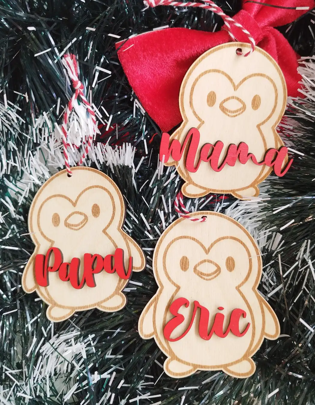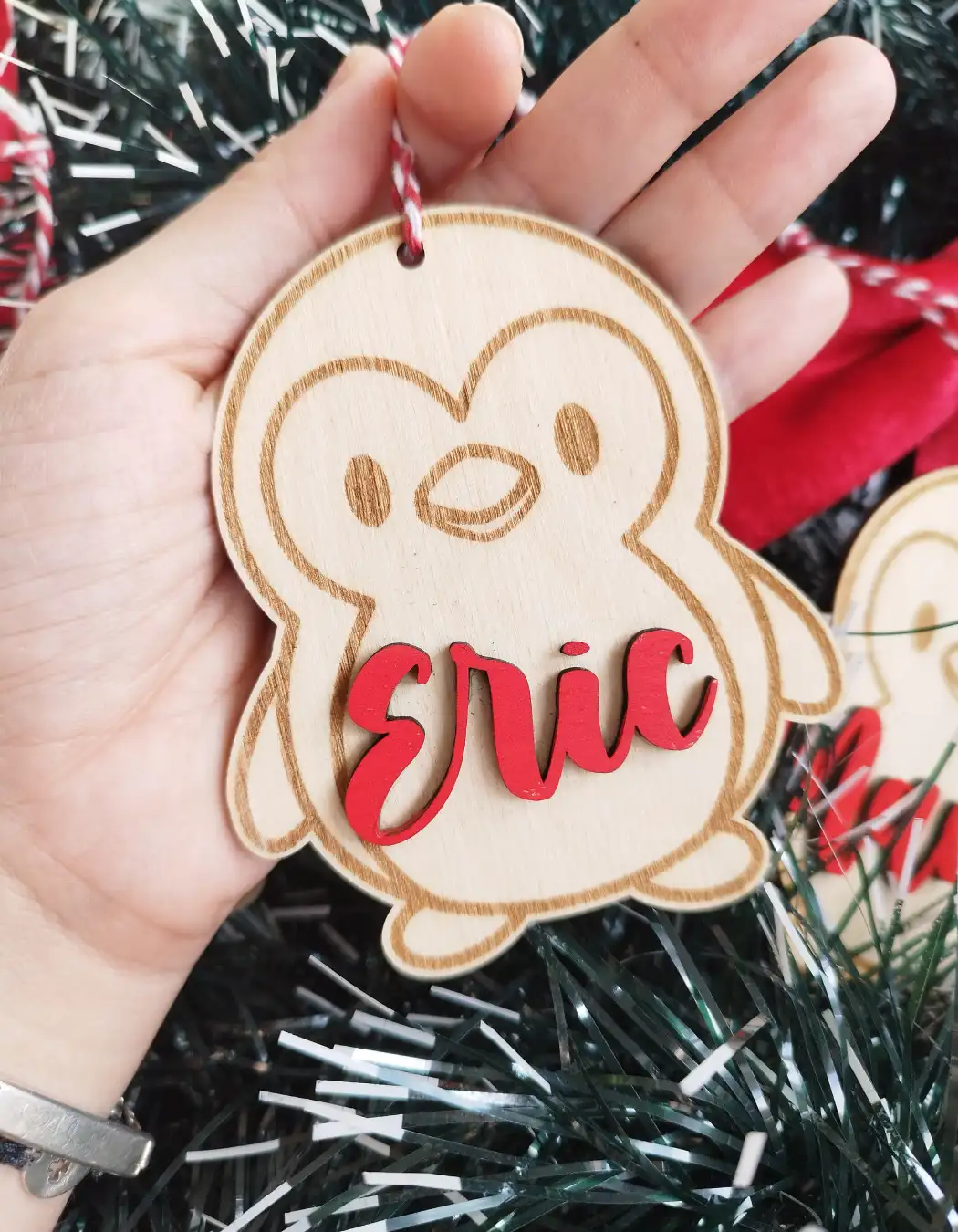 Adorno personalizado para el árbol o ideal como marcasitio navideño. Hecho en madera de pino, con el nombre pintado a mano. Da un toque especial a estas navidades con esta decoración navideña tan familiar y bonita. Sostenible y reutilizable.