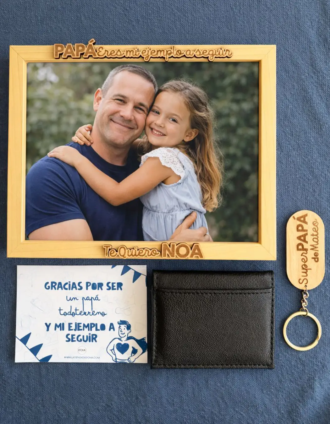 Pack incluye: Tarjetero + Llavero Superpapá personalizado + Marco de fotos de madera con frase «Papá eres mi ejemplo a seguir» «Te quiero/Te queremos + nombre del/los peques»