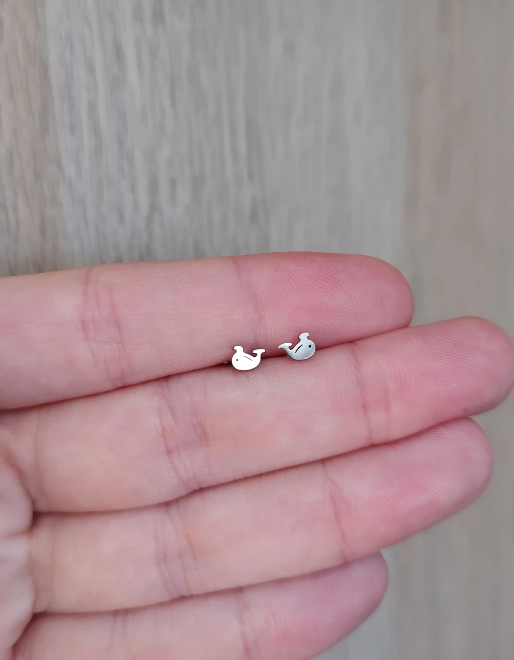 Pendientes Ballenas mini. Cierre de rosca, anticlavaduras. Antialérgicos y resistentes al agua. Material acero. Incluye el par.